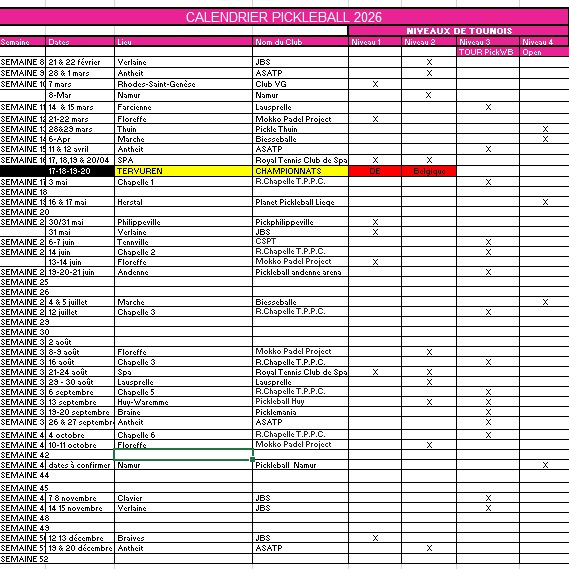 Voici le calendrier des tournoi soutenus par Pickleball Wallonie-Bruxelles. Les affiches des tournois seront publiées sur notre site et la page facebook au fur et à mesure de leur réception. A noter que d’autres tournois peuvent s’ajouter en cours de saison, il faut pour cela envoyer un mail à patrick.haumont@tppwb.be