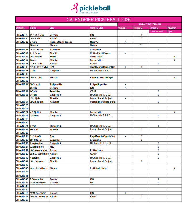 Le calendrier 2026 des tournois soutenus par Pickwb