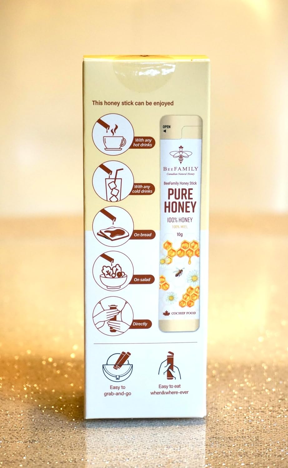 Beefamily honey stick is a delicious treat containing premium Canadian products in every product.Beefamily honey stick is the perfect answer for when you need a boost of energy anytime, anywhere.Whether you’re travelling, studying, or just craving a sweet snack, the honey stick is easy to grab-and- go and the perfect size for your bag or pocket.Beefamily honey stick can be enjoyed straight from the sachet, mixed into hot or cold drinks, on bread, or on a salad.