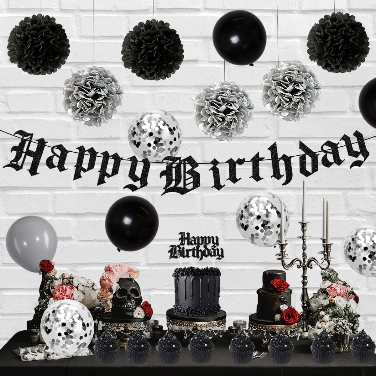 Our Gothic Birthday Party Decorations are ideal for any age’s birthday party, fit for both men and women, adults, boys or girls.Packing list:1pcs black old English “happy birthday” glitter banner 1pcs black circle dot glitter garland - 13 feet 1pcs black old English “happy birthday” cake topper 20pcs balloons - 12 inch (10 black, 5 confetti, 5 grey, Helium Supported) 8pcs tissue pom poms - 10 inch (4 black, 4 grey)If you have any dissatisfaction with our products, please contact us actively and we will solve the problem for you wholeheartedly.Warm Tips:1. Children should use these balloons under the supervision of an adult. 2. Please don't over-inflate these balloons to prevent bursting, 80-90% is fine. 3. Keep these balloons away from pointed objects and avoid exposure to direct sunlight. 4. Please allow slight color differences due to different monitors and the lighting during photo shooting. 5. Please allow slight size errors due to manual measurement. 6.Latex balloons will have some latex odor, if you are sensitive to latex odor it is recommended that you receive the package will be placed in a ventilated place for an hour or two to dissipate the smell.7.Please note that ribbon and balloon inflation tool are included in the package, you don't need to buy additional assembly accessories.The HAPPY BIRTHDAY banner is to be strung by yourself, you can adjust the spacing of the letters according to the actual occasion.
