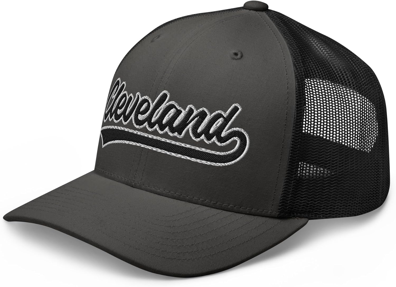 A stylish, mid-profile trucker cap that was created for people who love Cleveland, this retro Cleveland trucker hat is is sure to be appreciated by fans of Cleveland sports and anyone who is from Cleveland, OH. Features an embroidered retro Cleveland sports script with swoosh. An awesome gift or souvenir, this mesh Cleveland trucker cap is an excellent choice for lovers of C-Land. Mid-profile, structured 6-panel Cleveland hat60% cotton, 40% polyesterHard buckram front panels w/ mesh backPermacurv visor, matching undervisorPlastic snap closureHead circumference: 21 ⅝” – 23 ⅝”Type: Cleveland trucker hat, mesh trucker capEmbroidered in the USACleveland GoTime Apparel